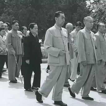 【周恩来,刘少奇,朱德等人胸配白花,臂缠黑纱出席他的追悼会】1960年5月29日,延安五老之一的林伯渠同志逝世,照片记录的是追悼会的情景。周恩来,刘少奇,朱德等胸配白花,臂缠黑纱神情肃穆走在前面,后面是延安五老中的董必武,低着头,神情哀伤。他的旁边是宋庆龄先生,一身黑装,送别林老。再后面是因腿伤杵着手杖的邓小平和当时其他领导人。一同送别林伯渠老人。